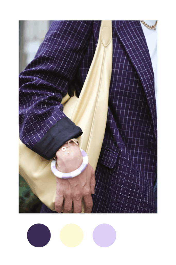 Cet été, j’ai porté cette veste violette adorée (Claudie Pierlot, dénichée sur un site de ventes privées) avec mon sac (tout autant adoré) & Other Stories qui m’a accompagné toute la saison. Ce jaune et ce violet, comment vous dire, a ravi mon cœur de geek des couleurs. J’y ai ajouté ce petit bracelet vintage tout à fait dans la même veine. En plus, des rayures et des carreaux ! (Une autre de mes passions, les motifs géométriques)